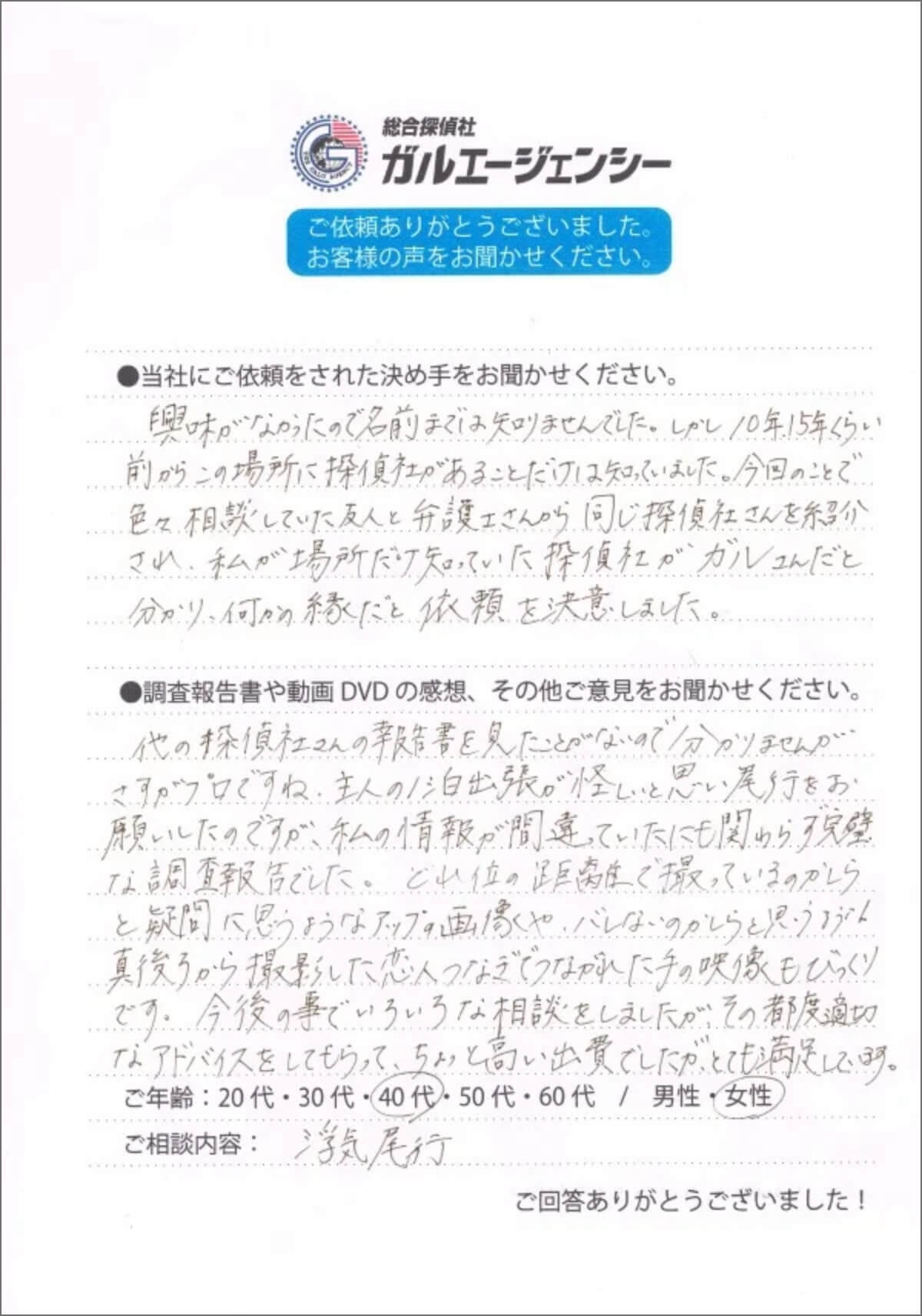 以前から場所だけは知っていた探偵社を、友人と弁護士の両方から勧められ「縁」を感じて依頼。情報に誤りがあったにもかかわらず、驚くほど鮮明で的確な調査報告に感服しました。