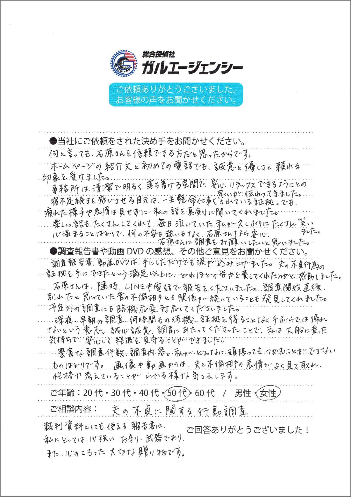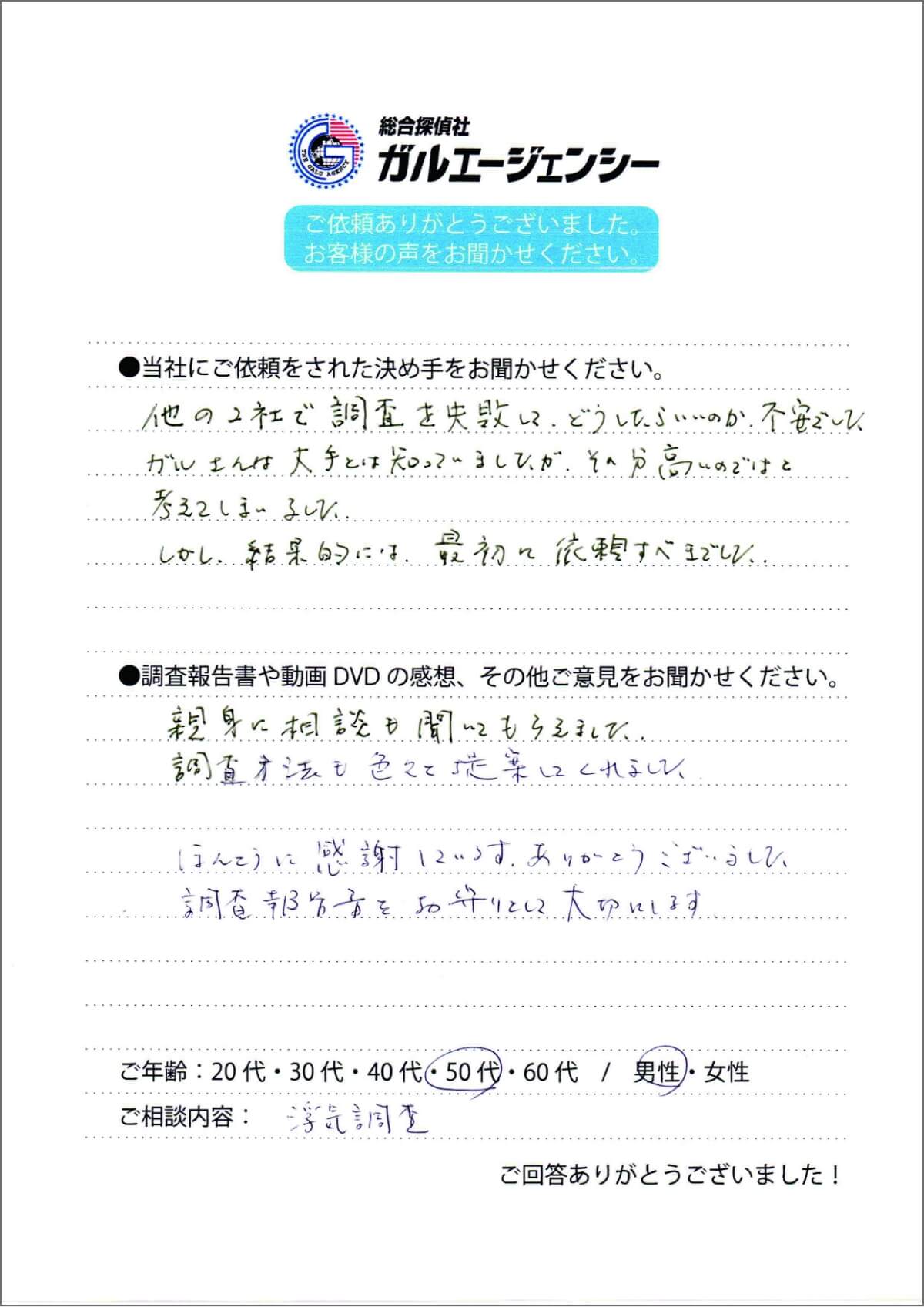 他の2社で調査を失敗して、どうしたらいいか不安でした。ガルさんは大手とは知っていましたがその分高いのではと考えてしました。しかし、結果的には最初に依頼すべきでした。
