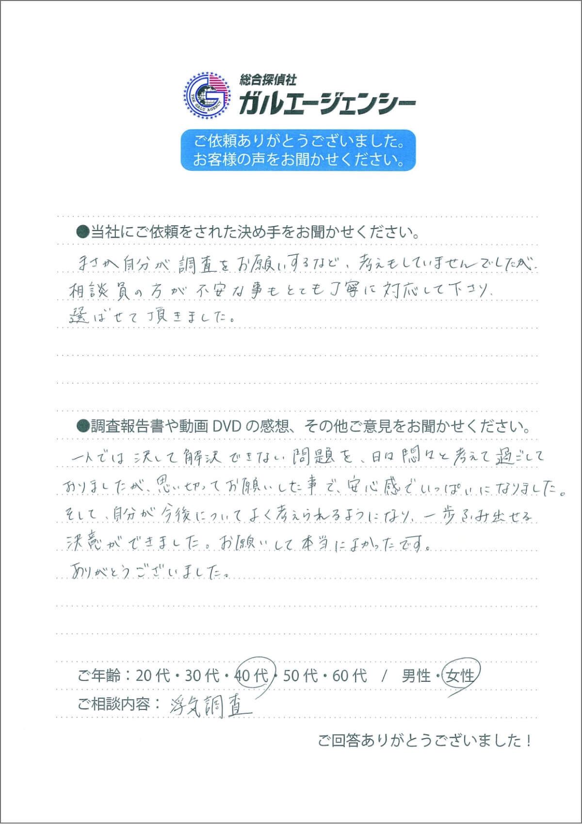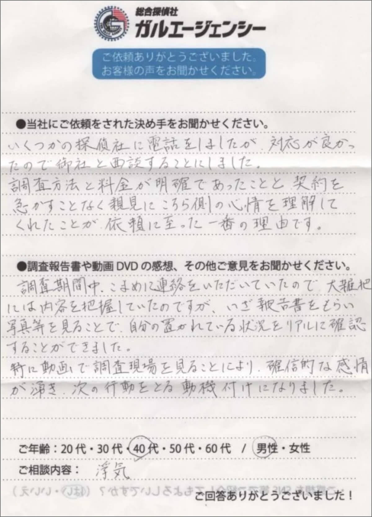 複数の探偵社に相談する中で、御社の丁寧な対応と明確な調査内容・料金説明、契約を急かさず親身に話を聞いてくれた姿勢に信頼を感じ依頼を決意。